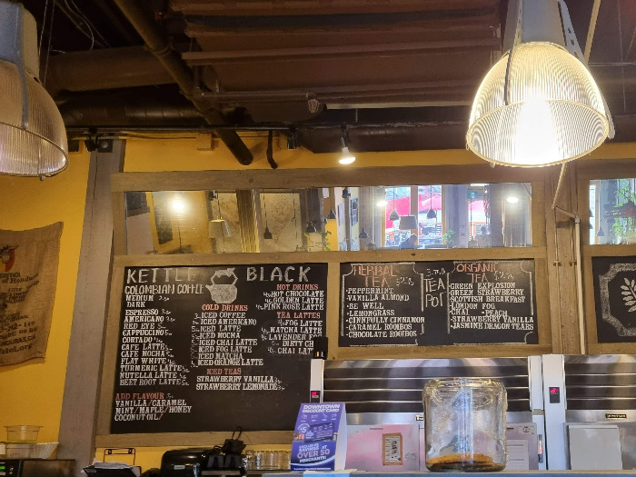 캐나다 PEI 샬럿타운의 다운타운 중심은 퀸 스트리트와 켄트 스트리트가 교차한다. 두 거리에 있는 커피숍 여러 곳을 소개해보려 한다. 나의 이전 글 '첫 비오는 날, 샬럿타운에서 첫 커피를'에서 밝혔듯이, 이곳에 도착한 뒤로 며칠 동안은 커피값이 아까워서 숙소에서 커피를 해결했다. 그러다가 달콤한 도넛 향과 주룩주룩 내리는 비의 유혹을 뿌리치지 못하고 커피를 한 잔 주문했다. 밍밍했던 커피, 그 뒤로 맛있는 커피를 꼭 먹어봐야겠다는 의지가 생겼다. 그래서 자주 가던 샬럿타운 도서관 내 커피숍을 시작으로 몇 곳 카페의 커피를 마셔보았다. 그중에서 가장 추천하고 싶은 곳은 'KETTLE BLACK' 케틀 블랙이다.