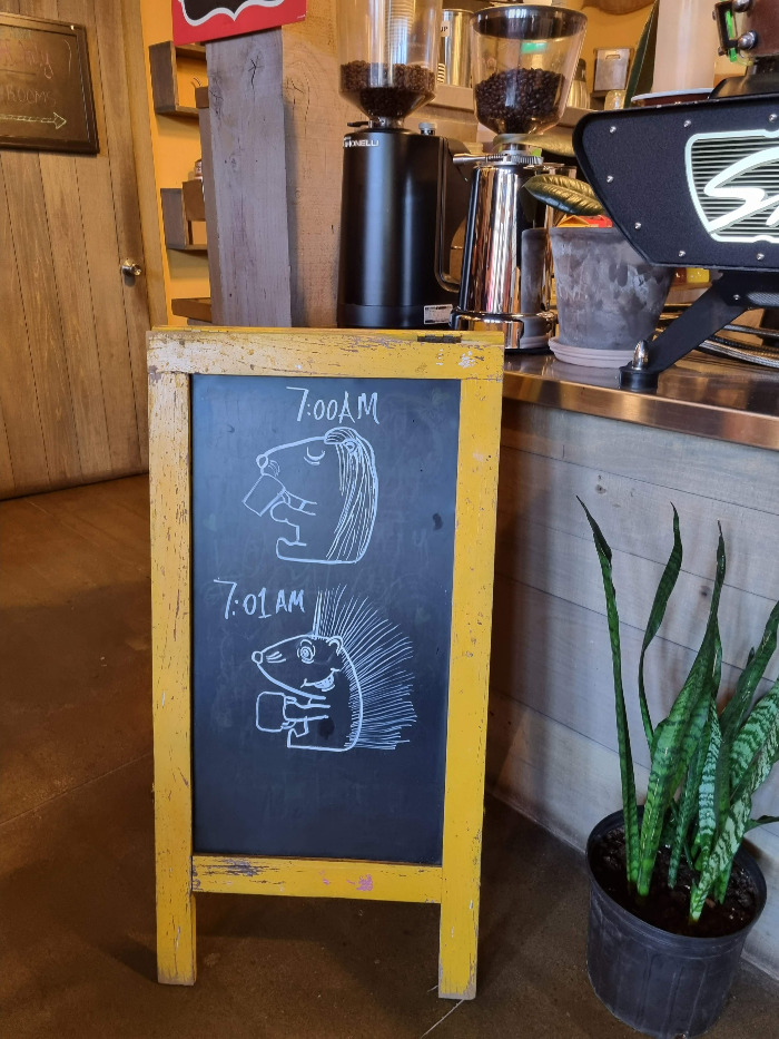 케플 블랙의 노랑 문을 열고 들어가면, 카페 내부가 아기자기하다. 카운터 앞에는 7시에 커피를 마신 고슴도치가 1분 뒤에 정신이 확 드는 장면을 그린 그림이 있었는데, 줄을 서서 기다리는 동안 미소를 짓게 만들었다. 카페인의 성능을 묘사한 멋진 그림이다. 고슴도치 그림 위에는 와이파이 비밀번호가 적혀 있었다. 커피를 마시며 편안하게 와이파이를 사용할 수 있는 카페이다.
