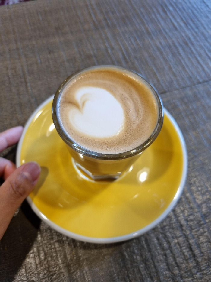 더쉐드의 코르따도는 어떤 맛일까? 달고나같은 맛이 느껴졌다. 다른 커피숍에서보다 이곳 더쉐드에서 사용하는 원두가 맛있게 느껴졌다. 코르따도의 우유맛과 함께 느껴지는 원두맛이 마음에 든다. 다음날에는 플랫 화이트를 주문했다. 플랫 화이트는 코르따도보다 우유거품이 많고 라떼아트를 그려서 제공한다. 샷이 진한 카페라떼를 마시는 느낌이다. 진한 커피를 마시고 싶은 날에 카페라떼나 카푸치노는 조금 밍밍하다. 그럴때는 플랫 화이트가 딱 좋을 것 같다. 조금더 커피의 쓴 맛을 즐기고 싶다면 코르따도가 답이다!