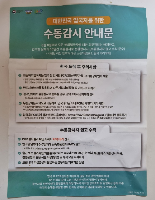 '대한민국 입국자를 위한 수동감시 안내문'