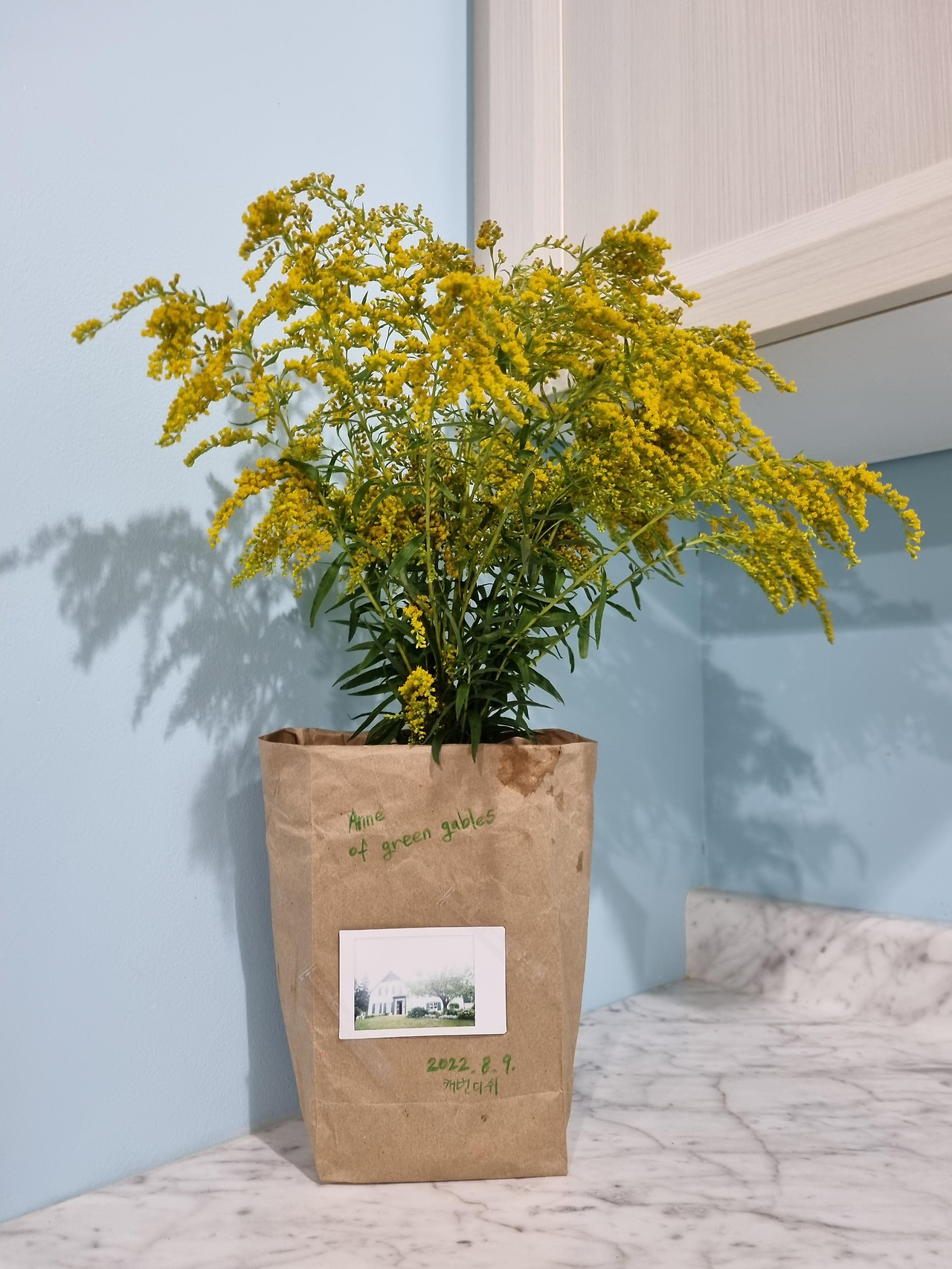 새하얗고 탐스러운 레이스 사이에 듬성 듬성 노란 꽃이 보였다. 당근꽃과 비슷한 높이의 노랑꽃은 아마 좁은 길 건너편에서 이사를 온 것이리라. 길가 반대쪽에는 키가 큰 나무와 노랑꽃이 많았다. 오솔길에 다달았다. "엄마, 이것봐!" 큰 아이가 발 아래에서 노랑꽃 다발을 주워 들었다. 흙이 전혀 묻지 않고 마르지 않을 걸 보니 가지에서 떨어진지 얼마되지 않은 듯 하다. 나와 아이들은 심술궂은 장난을 친 범인으로 오전 내내 노호했던 폭우를 지목했다. 아름다운 노랑꽃 다발을 들고 새하얀 당근꽃을 배경으로 해서 사진을 여러 장 찍었다. 그리고 노랑꽃을 숙소로 가져와 물병에 물과 함께 넣어 주었다. 물병을 작은 종이봉투 안에 넣었는데, 슈퍼마켓 점원이 뚜껑 없는 플라스틱 통에 담긴 블루베리를 감싸 건네주었던 것이다. 앤의 집을 찍은 폴라로이드 사진 한 장을 가운데 붙인다. 제한된 재료로 제법 운치있는 오브제를 만든 것 같아서 만족스러웠다.