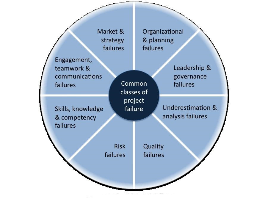 성공하거나 실패한 프로젝트에 참여한 경험이 있는 300명 이상의 연구자 사례와 실패 카탈로그를 바탕으로 프로젝트 실패의 대부분을 차지하는 원인들이 나타납니다. 위의 그림은 이러한 원인을 분류하고, 이에 대한 토론의 뼈대를 만드는데 강력한 도구가 됩니다. 위의 그림에서 보듯, 실패의 원인은 크게 8개 카테고리로 나눌 수 있습니다.