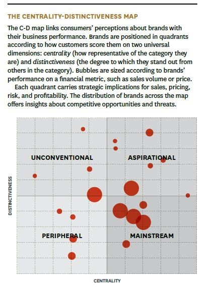 어떠한 브랜드의 성격을 가질지에 대한 회사의 선택은 브랜드 이미지뿐만 아니라 판매량, 가격, 이익률까지 영향을 미치기에 대중성과 독창성의 적절한 균형은 매우 중요하다. 마케터에게 이 균형을 잘 유지하기 위해 필요한 도구는 부족해 보인다. 전통적으로, 기존 회사들은 브랜드 포지셔닝과 브랜드 퍼포먼스를 따로 분석했다: 시장에서의 차별화 형성과 소비자의 브랜드 선호도 측정 등을 위해 마케터들은 지각 포지셔닝 맵을 이용 했다. 이 Perceptual positioning map은 저가형과 고가형, 매움과 싱거움 등의 상반된 요소들만 반영했다. 브랜드 퍼포먼스를 평가하기 위해 시장 점유율, 성장률, 이익률과 같은 기준들로 브랜드를 기획, 측정하는 다양한 전략적 툴 셋을 활용했다.