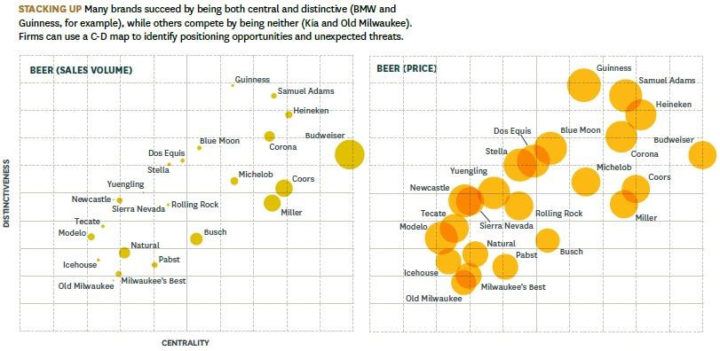 기존의 맵들은 보통 지엽적인 제품 성격에 (narrow product characteristics) 대한 소비자 인식을 측정해왔다. 예를 들어 맥주라면 쓴맛과 거품 같은… 그런데 이런 기준의 맵에서 꼭 인접한 브랜드라고 해서 경쟁자는 아니다.