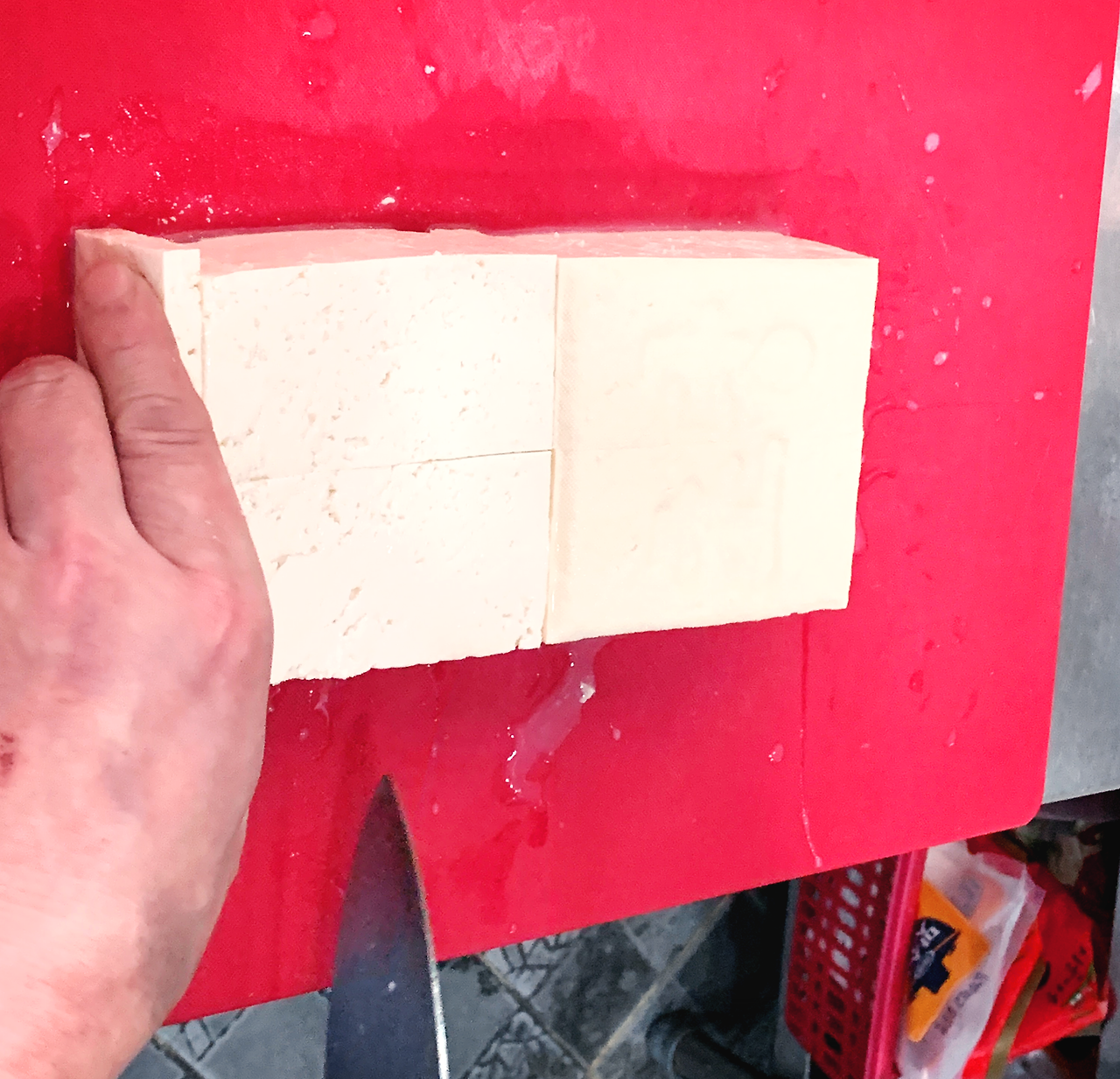 긴 면을 세로로 세운 후 커팅하는 방식의 두부 썰기.
