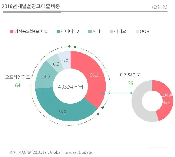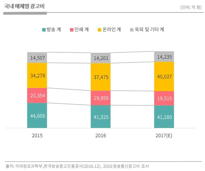 효과적인 마케팅 소통을 하기 위해 브랜드는 고객이 있는 곳 - 대부분의 소비자가 스마트폰을 가진 이때 - 온라인에서의 활동을 특히 강화 해야 한다. 아래의 매체별 광고비 그래프를 보면 온라인 계열 소통이 가장 큰 성장을 하고 있음을 확인할 수 있다.