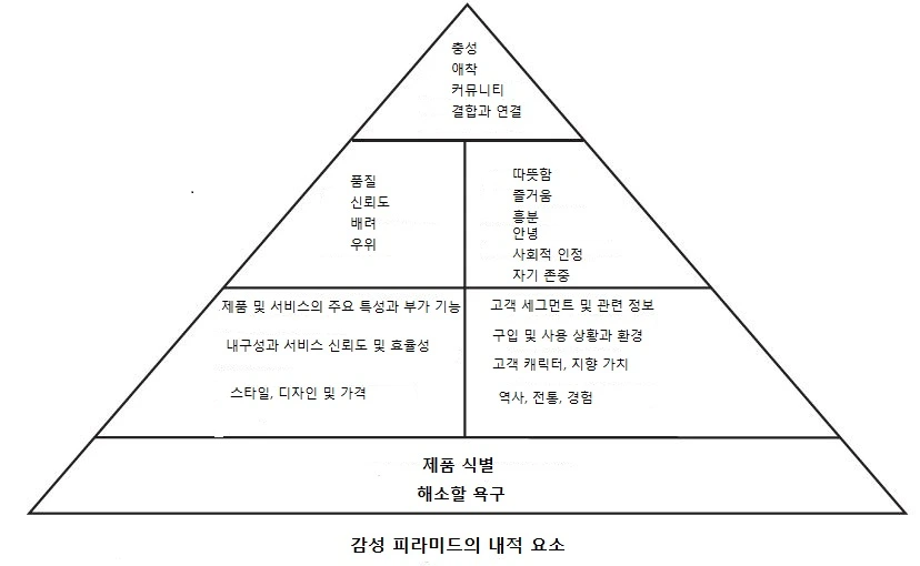 나이키라는 브랜드에 대해 두 명의 소비자가 있다고 간단히 가정해보자. 브랜드 지식이 전무한 상태에서 '요즘 뜨는 브랜드'라는 정보 한 가지만 습득한 소비자와, 과거 본인의 해당 브랜드 사용 경험(성능, 평가), 농구팬으로써 해당 브랜드를 대표하는 농구선수에 대한 애정(감정)이 있고 더 나아가 사용시의 개인적 뿌듯함까지 느끼는 소비자가 있다면, 후자의 소비자가 브랜드에 대한 반향과 긍정적 반응에 더욱 적극적이라고 말할 수 있는데, 이러한 접근 방식으로 '고객감성피라미드'의 구성요소를 촘촘히 만족시키는 전략 수립이 필요하다.