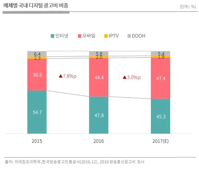한편 디지털 광고비의 비중은 모바일 플랫폼이 증가 추세에 있음을 알 수 있다. (하단)