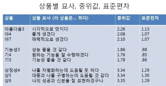 새로 개발된 측정 지표를 바탕으로 위의 프로세스를 거쳐, 상품의 디자인에 대한 고객의 묘사와의 강한 연관성을 확인하였고 각 디자인 요소간의 상호 상관 관계까지 확인하였다. 이를 통해 우리는 아름다움과 기능성 사이의 상관관계가 크고 (.64) 기능성과 상징성 사이의 상관 관계는 상대적으로 그보다 적다고 (.34) 알게 되었다. 그러면,