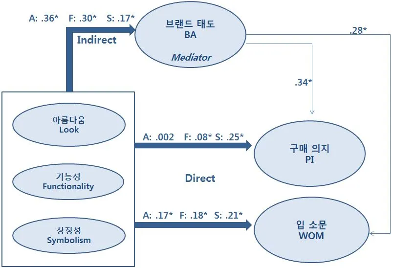 - 입 소문 종속 변수에 대하여, 간접적 영향은 각각 아름다움 .10, 기능성 .09, 상징성 .05로 나타났다.