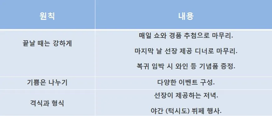 반면 초기의 더딘 출발로 일정 시간 성과를 내지 못하는 분야에서 끝이 임박할 시점 큰 성과가 나타났다면 예상치 못한 고객의 기쁨은 더욱 배가될 수 있다. 강한 결말까지는 아니라도 긍정적인 마무리는 꼭 필요하다.