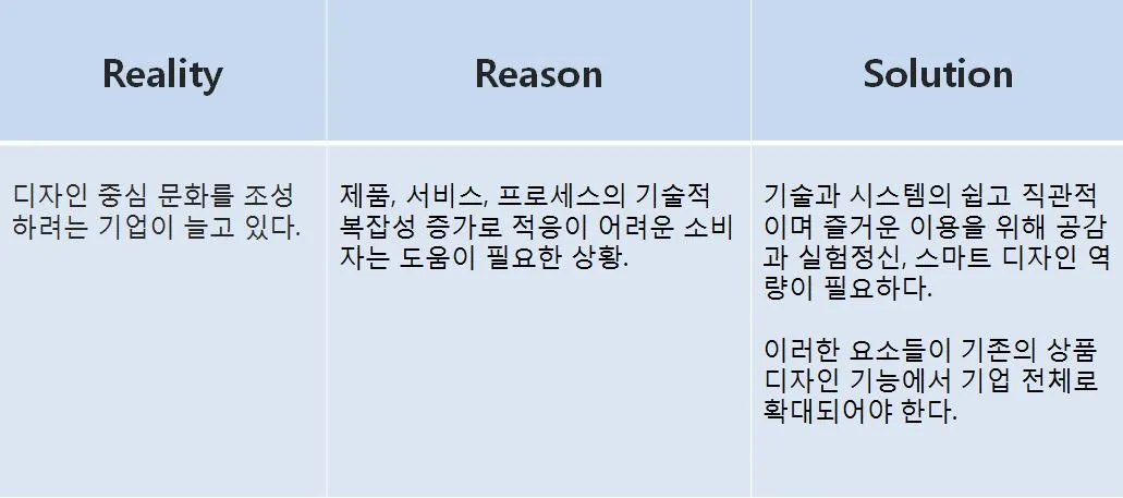 또한 기업의 생존 환경이 매우 척박하기 때문에 미래 생존을 위한 다양한 경로의 실험과 개발도 필수적이다. 기업이 직면하는 사업의 복잡성은 수를 헤아리기 어려울 정도로 많지만 그 안에서 공통점들을 발견할 수 있다; 복잡성을 사람들이 쉽게 이해하도록 도움이 필요하다는 사실이다. 복잡한 기술과 시스템을 더욱 심플하고 직관적이며 즐겁게 사용하도록 하기위해 디자인 씽킹이 필요하다는 말이다.