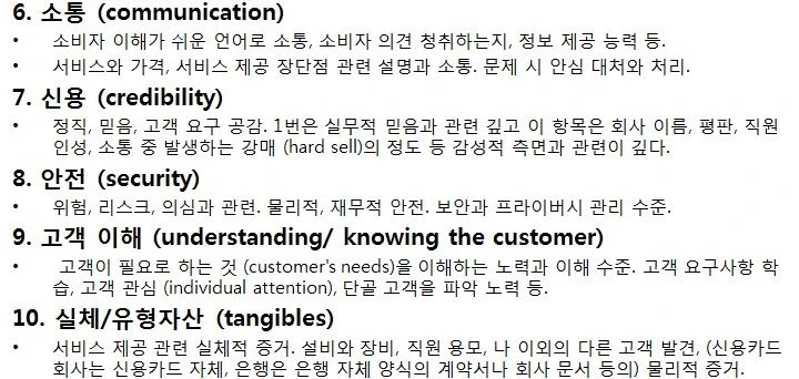 설문에 참여한 소비자 그룹도 서비스 품질에 대한 설명과 정의 내리기에 대한 질문을 받았을 때 탐색, 경험, 평가 난항 영역등에 대해 언급했다. 이러한 특성을 바탕으로 표 1과 같이 10가지의 서비스 품질 결정변수로 분류하고 평가가 쉬운 항목에서 어려운 항목으로 배열할 수 있다.