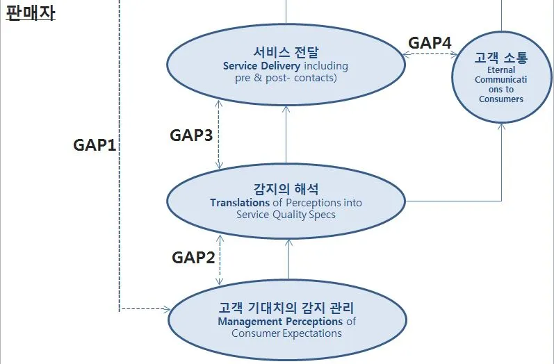 임원진 인터뷰로 드러난 이 차이는 밑의 그림의 하위 부분 (판매자 영역)에 위치한다. 이 그림은 소비자 포커스 그룹과 임원 심층 인터뷰에서 얻어진 서비스 품질의 개념과 서비스 품질에 영향을 주는 요인을 나타낸다. 해당 부분은 판매자쪽의 '차이' (GAP1, GAP2 등)를 설명하고 이런 차이로 인한 대안을 제시한다.