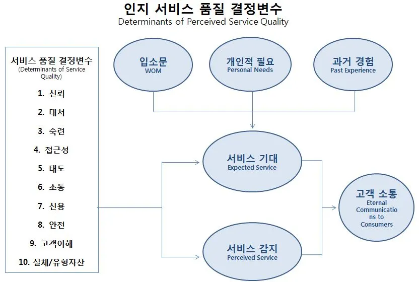 그림 2(아래)는, 인지(경험)한 서비스의 품질은 소비자가 기대한(expected) 서비스와 인지한(perceived) 서비스간 비교의 결과로 나타남을 말한다. 소비자 기대치를 형성하는 10가지 변수의 상대적 중요성은 전달된 서비스에 대한 소비자 인식과 비교했을 때의 상대적 중요도와는 다를 것이다.