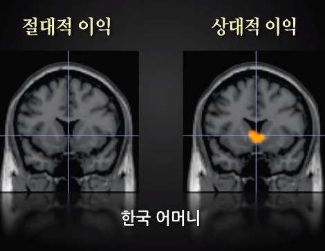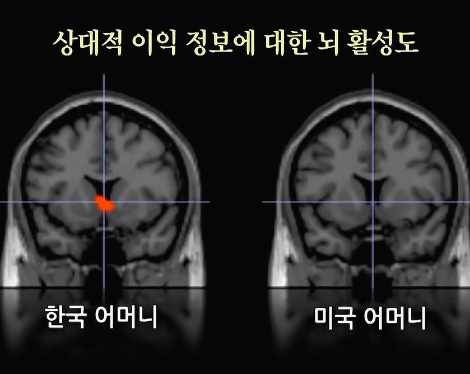 즉 자신의 이익 여부가 아니라 상대방의 손익에 따라 한국 엄마들의 보상 뇌가 반응하였다.