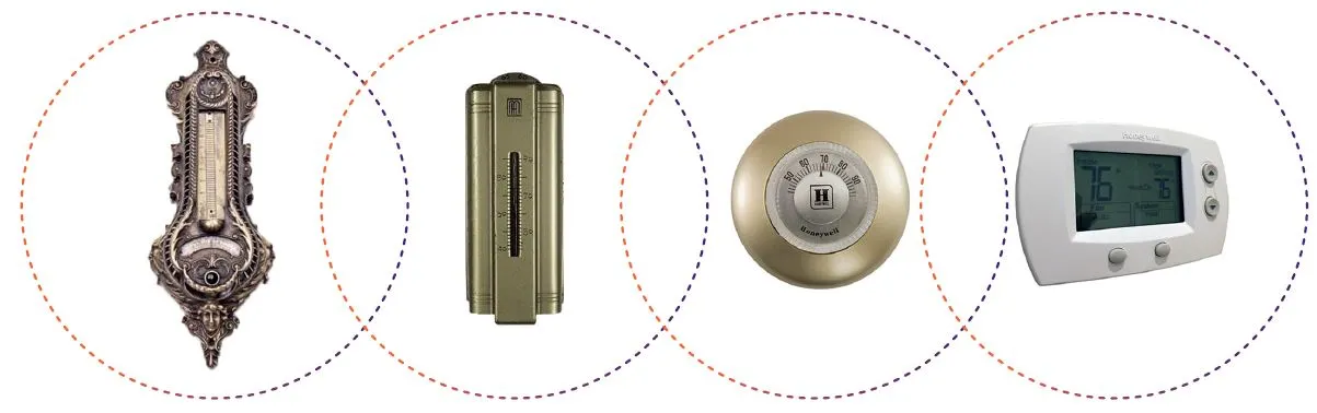Honeywell과 Siemens 온도조절기는 서양 주택의 표준처럼 여겨졌고, 해마다 장식 요소는 줄이고 기능은 추가시켰다. 베이지에서 화이트, 금속에서 플라스틱, 다이얼에서 발광형 터치스크린, 온도계 디자인이 바뀐 건 알겠는데 관심을 끌 정도는 아니었다. (그림 1)