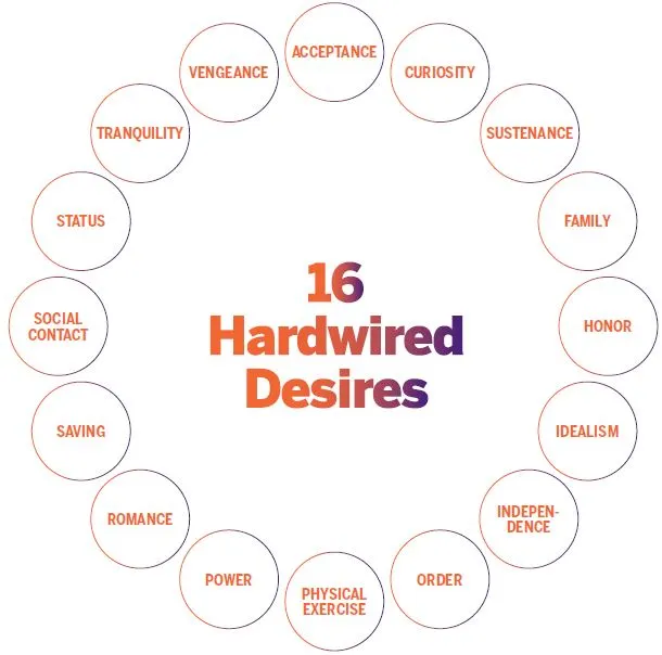 힘 Power, 호기심 Curiosity, 독립 Independence, 상위 Prestige, 사회적 접촉 Social Contact, 복수Vengeance, 영광 Honor, 이상주의 Idealism, 건강 Physicality, 로맨스 Romance, 가족 Family, 규칙 Order, 지속 Sustenance, 수용 Acceptance, 평온 Tranquility and 절약 Saving.