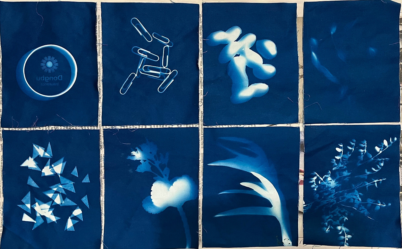 시아노타입(Cyanotype)은 일종의 판화 기법으로 청사진을 말한다. 시료를 바른 종이나 천 위에 물건을 올려놓고 빛을 쬐어주면 그 모양이 나타난다. 선인장과 풀, 나뭇가지 등을 아내에게 부탁해서 가져다가 시아노타입 천 위에 올려 햇볕에 10-15분가량 노출했다가 물에 담가 시료를 제거해서 무늬를 만들었다.