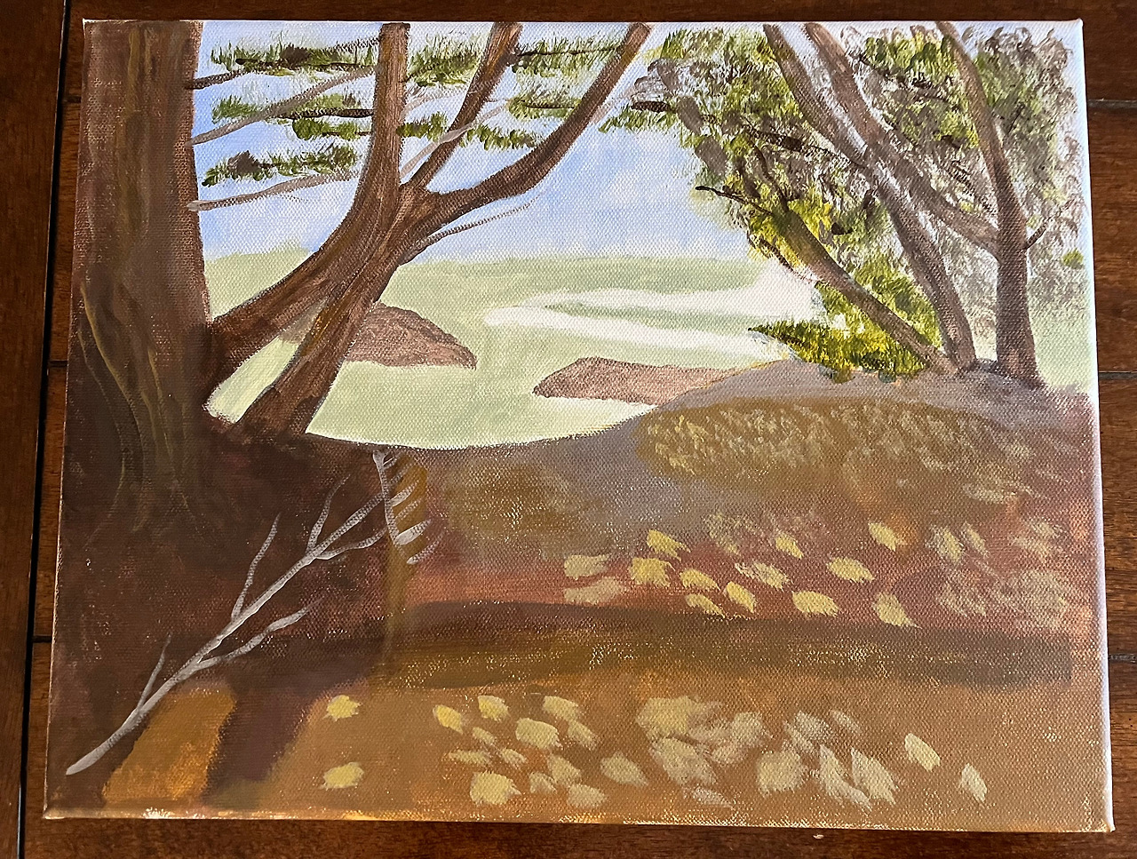 다음날 아침, 어제 받은 사진을 꺼내 놓고 대충 그림을 그려 선생에게 이-메일로 보내고, 1:30분 수업에 들어갔다. 엉성해 보이던 선생의 그림은 점점 자리를 잡아 가는데, 내 그림은 생각처럼 마무리가 되지 않는다. 물감이 잘 칠해지지 않는다. 선생에게 물어보니 아크릴 물감은 물을 조금 섞어야 캔버스에 골고루 잘 발라진다고 한다. 배운 대로 해 보니 역시 잘 된다.