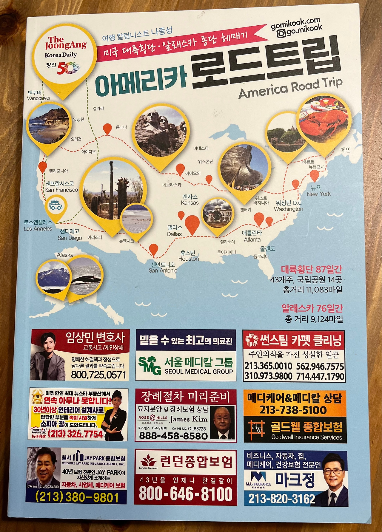 최근에는 여행 칼럼니스트 ‘나성종’ 씨가 쓴 ‘아메리카 로드트립’을 재미나게 읽었다. 이 책은 미주 중앙일보가 발행하여 정기 구독자들에게 나누어 주는 비매품이다. 과거에는 신문사에서 생활정보가 담긴 책을 만들면 구독자들에게 신문과 함께 배달을 해 주었는데, 이 책은 신문사에 와서 받아 가라고 했다.