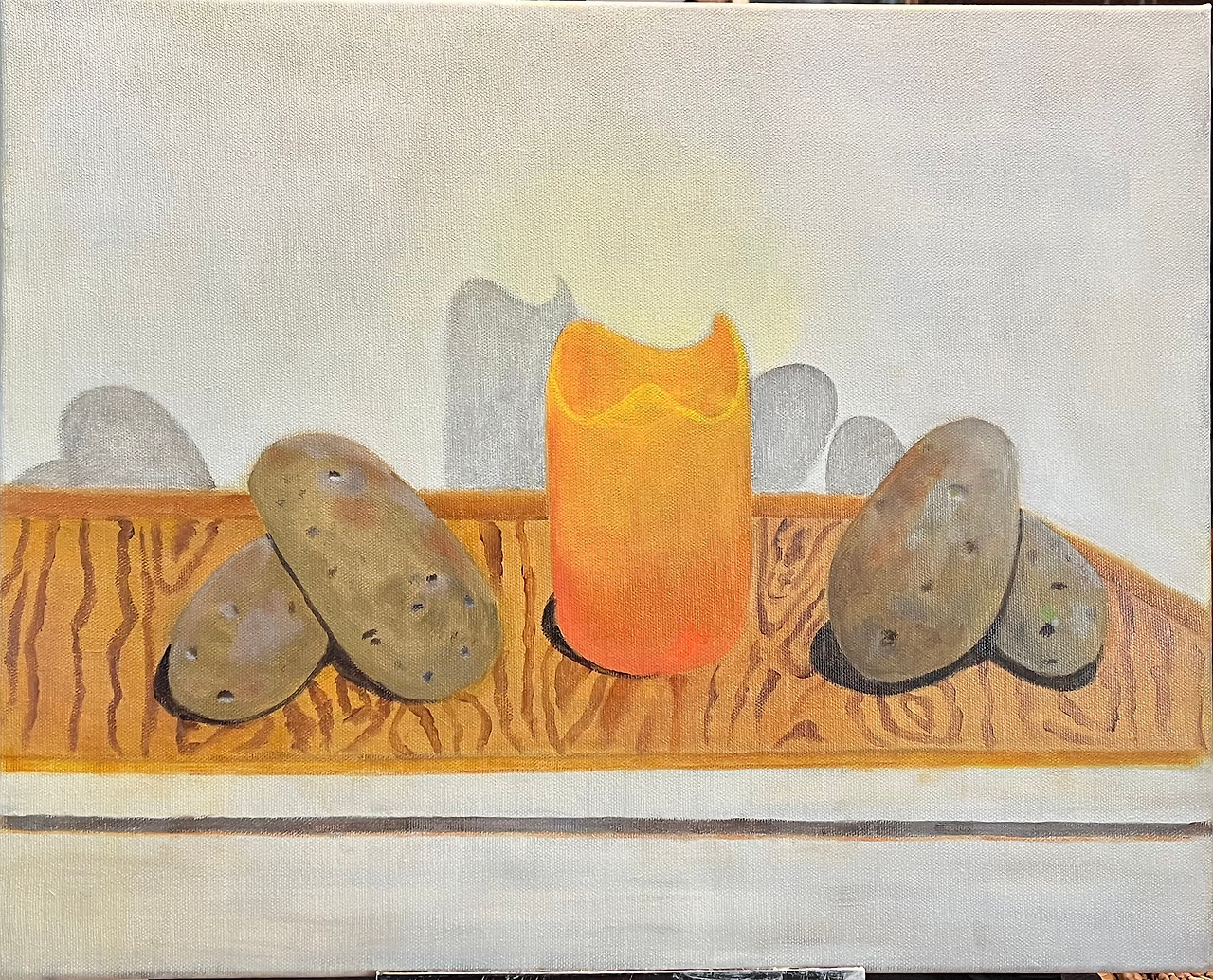 나도 이날 두 개의 그림을 가지고 갔다. 5, 6명의 작품을 평가하고는 10-15분 휴식시간을 갖는데, 내 작품에 대한 평가를 끝낸 후 잠시 쉬는 시간에 중년 여성이 다가와 ‘감자와 초를 그린 그림’을 어떻게 할 건지 묻는다. 차고에 보관할 것이라고 하니, 그림이 마음에 들어 갖고 싶다고 한다. 줄 수 있다고 했더니, 그냥 가져갈 수는 없고 사겠다고 한다. 얼마에 팔 것인지 묻지 않았고, 나도 그녀에게 얼마에 사겠느냐고 묻지 않았다.