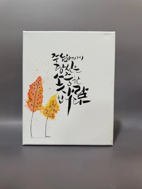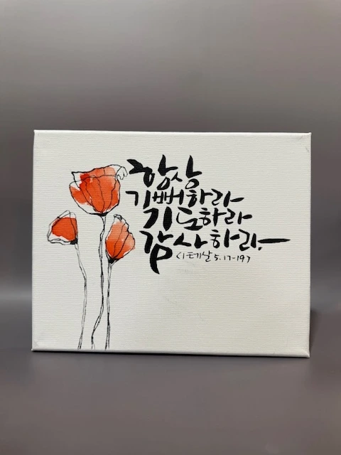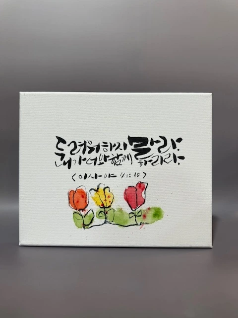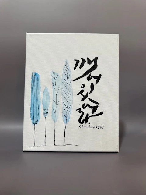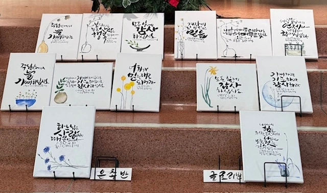 지난여름 신자들의 연락처를 업데이트하며 신부님은 각 가정이 마음에 품고 살고 싶은 성구를 적어 내라고 했다. 신부님이 추리고 정리한 가정 성구를 H 씨가 캘리그래피로 쓰고, 여기에 J 씨가 그림을 그려 넣어 멋진 작품을 만들었다. 완성된 캔버스는 신부님이 구입해서 신자들에게 나누어 주었고, 수입금은 제대회 경비로 쓰기로 했다고 한다.