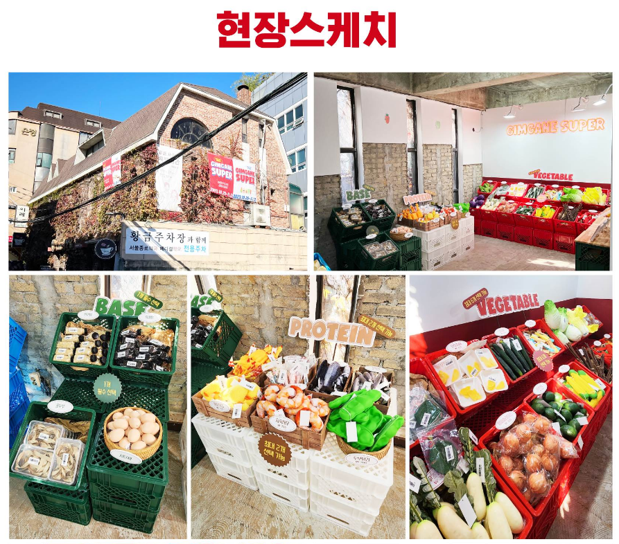 즉석김밥 전문 프랜차이즈 <김가네>가 대학로에서 팝업 스토어를 열었어요. 말 그대로 '슈퍼마켓' 컨셉으로요. 쇼핑하듯 장바구니를 집어 들고 식재료 모양의 귀여운 소품을 담아 카운터에서 계산을 마치면 나만의 커스터마이징 김밥 & 샐러드 볼을 만들 수 있답니다!