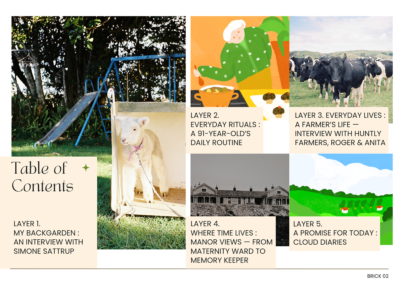 ‘차곡차곡 벽돌을 쌓는 마음으로, 하루하루를 소중히 살아가는 사람들의 이야기’ 브릭(Brick) 매거진을 발간했다. 동시에 뉴질랜드의 소도시 헌틀리의 이야기를 담은 마을 잡지이기도 하다. 2018년 처음 뉴질랜드에 도착해서 6년 동안 헌틀리에 살았는데, 적응을 하기가 무척 어려웠다. 오후 3시면 문을 닫는 카페, 마트 하나가 전부인 시내라니… 영화관, 미술관과 같은 문화 시설이 없는 도시가 너무 초라하게 느껴졌다. 그러다 적어도 내가 하나의 콘텐츠가 될 수 있지 않을까 생각했다. 헌틀리를 더 풍성하게 만들 수 있는 한 사람이 되자고 마음먹고 헌틀리에 대한 나의 시선을 담은 마을 잡지, 브릭(Brick, 벽돌)을 만들게 됐다. 실제로 헌틀리는 벽돌이 유명하고, 주재료가 되는 점토 매장지가 있어서 1884년부터 벽돌 생산을 시작해 지금까지 벽돌공장이 운영되고 있다. 무엇보다 단단하고 오래가며 지역의 색을 간직하고 있는 ‘벽돌’이 주는 의미가 좋았다. 우리의 하루도 작아 보이지만, 그 하루하루가 쌓여 우리의 삶을 지탱해 주는 습관, 분위기, 정체성을 만들어 가지 않을까. 벽돌 한 장처럼 매거진이 하나하나 쌓여갈 때 그만큼 헌틀리에 대해 알아가고, 마을 사람들과 관계 맺으며 커뮤니티를 이루어 갈 수 있지 않을까. 육아를 하며 ‘하루’도 아닌 지금 ‘한 시간’을 살기에도 벅차하는 나에게 보내는 위로이기도 했다. 별다른 의미를 부여하지 않아도 피곤한 몸으로 잠을 청하는 그 보통의 하루만으로도 아름답다고 말하고 싶었다.