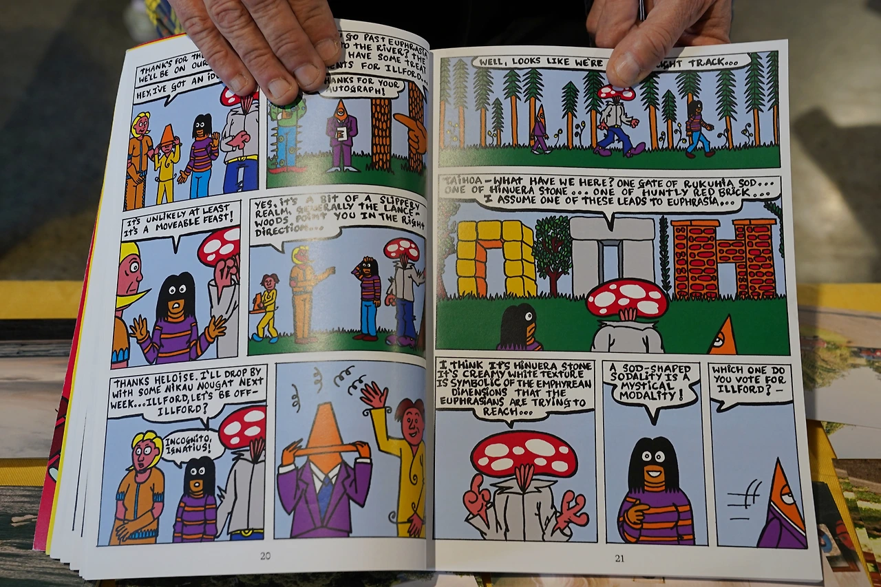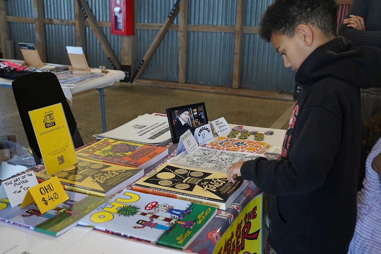 한편에는 테이블이 놓여있었는데, 그 위에 참여한 모든 사람들의 진들이 모여있었다. 지난해에 참여했던 사람들의 출판물까지 함께 있어서 둘러보는 재미가 있었다. 뉴질랜드가 섬나라여서 인지 바다를 주제로 하는 창작물들이 많이 보였는데, <Tidemarks>라는 제목으로 자신이 갔었던 해변의 이름과 그곳에서 그린 파도 물결 그림, 그 장소에서 적은 시가 함께 수록되어 있어 멋있었다. <ISLANDS>라는 책에서도 자신이 방문한 뉴질랜드 섬들의 이름과 사진, 그곳에서 했던 섬에 대한 사유를 산문시로 적고 있었다. 가장 인상 깊었던 부스는 뉴질랜드 해밀턴에서 활동한 만화가, 딘 밸린저(Dean Ballinger)의 작품들을 소개하는 곳이었는데 작가가 아닌 그의 친구들이 바쁘게 움직이고 있었다. 루게릭병으로 투병하다 48세의 나이로 세상을 떠난 작가를 대신해 그의 만화가 잊히지 않기를 바라며 친구들이 마켓에 참여해 알리고 있었던 것이다. 특히 작가의 <OHU>라는 만화는 캐릭터들이 와이카토 지역을 여행하는 초현실적인 이야기인데, 여기에 헌틀리 브릭에 대한 이야기가 나온다며 내게 책을 들고 와 페이지를 보여주기도 했다. 만화책에서 언급할 정도로 헌틀리를 대표하는 이미지가 브릭(벽돌)이 맞는구나 싶어 반가웠고, 또 만화책 곳곳을 꿰뚫고 있는 친구들의 애정이 느껴져 감동적이었다.