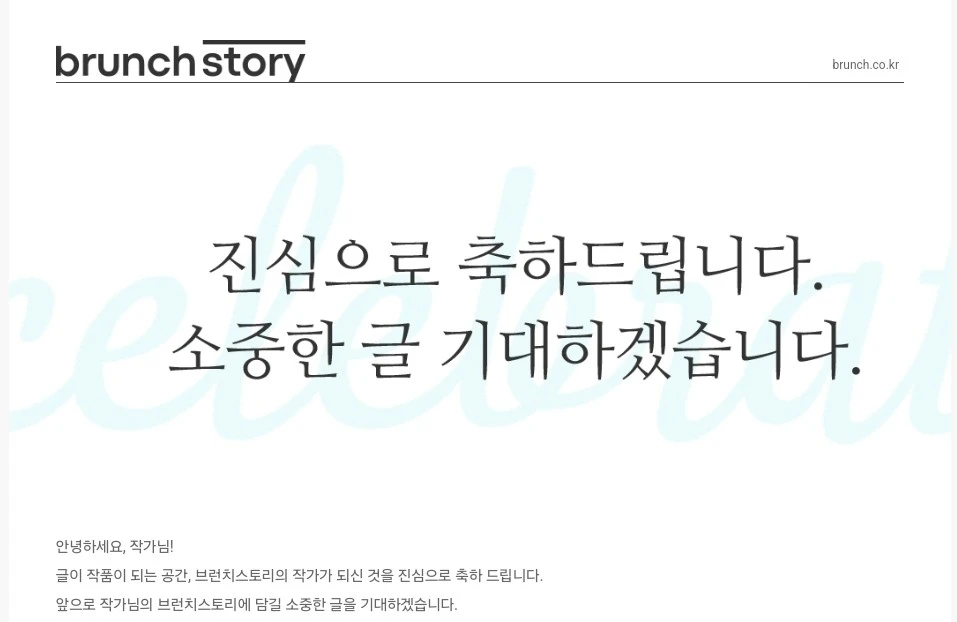 주일 저녁, 친구네 부부와 저녁을 먹다가 핸드폰 알림이 떠서 확인해 보니 브런치로부터 합격 메시지를 받았다.