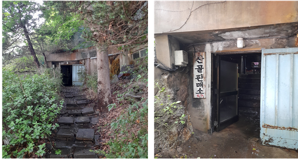 나는 그곳을 벗어나 도로를 따라 홍제동 쪽으로 방향을 틀었다. 해는 이미 정수리 위에서 끊임없이 열기를 더해 주고 있었는데, 전부터 보아왔던 ‘산골판매소’를 가보기 위해 나는 경사로를 힘겹게 오르기 시작했다. 지금은 두 쪽으로 갈라진 산의 2부 능선쯤 동굴 같은 구멍이, 산 안쪽으로 난 것을 본 적이 있었으며, 그 입구에는 ‘산골판매소’란 팻말까지 붙여 놓은 것을 봤기 때문이다. 생태연결다리를 막 지나고, 드디어 그 입구가 눈앞에 나타나고, 산의 침출수가 비 오듯이 떨어지는 2부 능선 위쪽으로, 판매소의 동굴입구가 그 자그마한 입을 열고, 나를 기다리고 있었다. 오르막은 돌을 깎은 계단식으로 되어있었으나, 산 위에서 떨어지는 물의 양이 만만찮게 많아서인지 계단은 물에 흠뻑 젖고 미끄러워, 오르기가 무척 조심스러웠다. 다소 음침하기 느껴지는 입구 쪽으로 가만가만 접근을 하니, 그 위쪽 안으로 희미한 불빛이 보이고, 이내 얼기설기한 철문이 나타나고, 그 너머로 오르는 또 다른 돌계단이 보였다.
