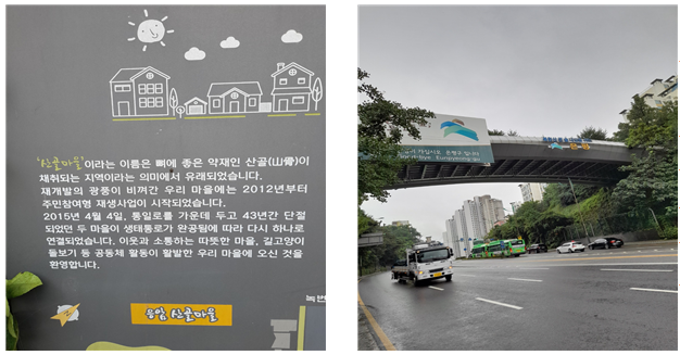 “마을이름이 산골마을이라고 하여 몇 가지 좀 물어보려 하는데요?” 나는 그를 쳐다보며, 다소 겸연쩍은 모습으로 첫 운을 띄웠다. 퉁명스러웠던 처음과는 달리 그는 조금은 상냥한 말씨와 미소로 나를 대해주기 시작했다. “아! 그 말이라면 나도 자세히는 모르지만 저리로 들어가서 안쪽에 비치된 안내문을 읽어보시면 돼요.” 하면서 왼손으로 한 쪽문을 가리켰다. 그러고 보니 안내간판 왼쪽 밑으로 실내로 들어가는 입구가 보였다. 나는 삐질삐질 배어 나오는 땀을 훔치며, 입구로 들어섰다. 한 세평이나 될까 말까 한 공간에는 특별한 것은 보이지 않고, 회원들의 모임공간으로 활용되는 듯 한 탁자 몇 개와 의자, 또 한쪽 켠 으로는 싱크대가 설치되어 간단한 식사정도를 해결할 수 있도록 되어있었다. 그가 말한 내 질문에 대한 대답은 그곳에서도 찾을 수가 없었으며, 나는 대충 눈인사로 그의 곁을 떠나, 마을 밑에 있는 길로 내려섰다. 이어서 또 다른 마을입구 안내판이 보였고, 그 앞에 서고 나서야, 비로소 나는 그 답을 발견할 수 있었다. 산골이란 한문으로 ‘山骨 ’(뫼산. 뼈골) 로서 뼈에 좋은 약재인 산골이 채취되는 지역이라는 의미에서 유래되었다고 한다. 원래 응암동 쪽과 한마을이었던 이곳은, 1972년 통일로가 개설되면서 둘로 쪼개져 있었는데, 지금은 생태연결다리가 두 마을을 이어주고 있다 하였다. 언뜻 연상되는 ‘산골짜기’의 산골과는 뜻하는 바가 전혀 다른 의미였다는 것을 알 수 있었다. 그렇다면 그 ‘산골‘은 도대체 어떻게 채취되었으며, 지금도 생산이 계속되고 있는지, 또 ‘산골마을‘과의 연결고리는 어떤 지가 궁금했다.