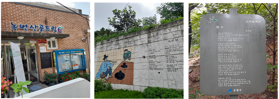 아파트 입구를 벗어나 ‘북한산 둘레길’ 쪽으로 방향을 잡았다. 시작부터 언덕인지라, 몇 걸음 떼지도 않았는데, 벌써 등줄기로 땀이 베이기 시작하고, 숨이 턱밑까지 차오른다. 의욕은 옛날과 별반 다를 바 없는데, 기력으로는 당할 재간이 없으니, 흐르는 세월을 누가 따라잡겠나? 그렇게 한 5분을 걸어 올라가니, 오른쪽으로 단독주택 몇 채가 나타나고, ‘산골마을’ 안내소의 간판이 저만치 보였다. 왼쪽언덕 담벼락엔 흰색 페인트를 바탕으로 검은 글씨로 정지용의 ‘녹번리’라는 시 구절이 삽화와 함께 씌어있고, 그 위쪽 조그마한 정자 옆에는 역시 그의 대표작이라 할 수 있는 시 ‘향수’ 전 구절이 조각된 현판이 비치되어 있었다. 그제야 이곳이 정지용의 기념초당 건립예정지라고 한 어느 향토신문 기사가 기억이 났고, 그의 마지막 집터가 녹번동 126-10번지(지금의 양광교회 뒤편)였다는 것도 어렴풋이 생각이 떠올랐다.