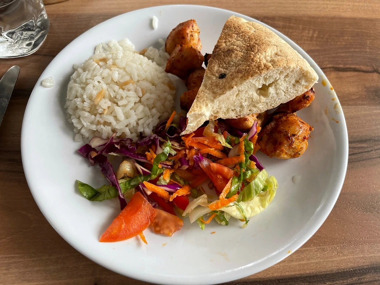 점심은 닭고기에 밥. 매콤하게 구운 닭고기에서 불향이 났다. 날아다니는 밥과 잘 어울렸다.