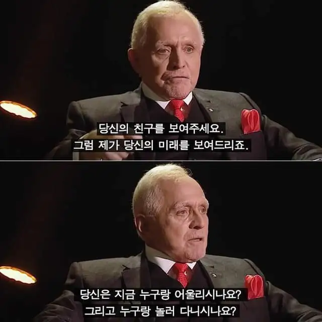 당신이 함께 어울리는 사람들이 바로 당신입니다. 당신의 친구를 보여주세요. 그러면 당신의 미래를 보여주겠습니다. (중략) 누구랑 어울리시나요? 누구랑 시간을 보내시나요? 빌 게이츠는 사람들과 안 어울려요. 내가 아는 스티브 잡스는 사람들과 시간을 보내지 않아요. 워런 버핏도 마찬가지예요. 일론 머스크도 사람들과 어울리지 않습니다. 어울리며 놀지 않는 사람들을 리스트로 열거할 수 있어요.