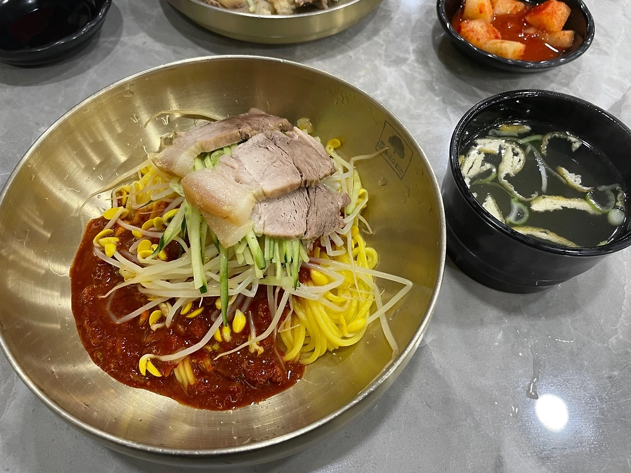 비빔국수, 수육은 맛있었다. (많이 시켰으면 남길뻔 했다. K의 판단이 옳았다.)