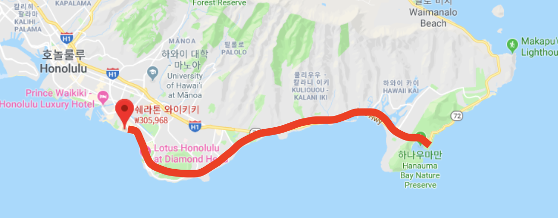 당시 숙소였던 와이키키 쉐라톤에서 하나우마 베이 전망대 까지 11.2마일, 약 18km정도였다. 걷기라는게 쉽다면 쉽고 어렵다면 어려운데, 그 이유는 코스에 따라 난이도가 천차만별이기 때문이다.