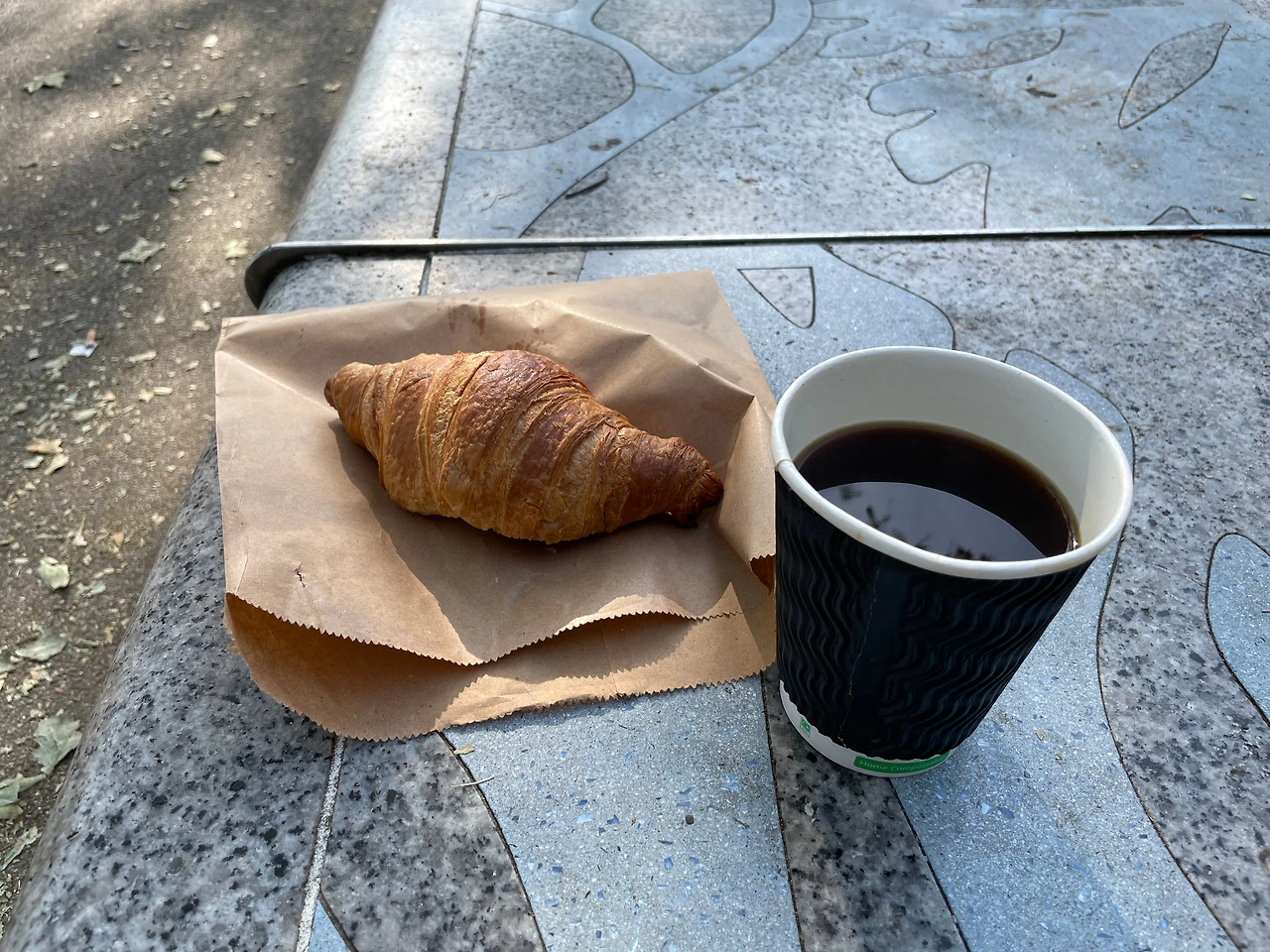 타워 브릿지를 건너고, 근처에서 좀 쉬기로 한다. 많이 걸었다. 마침 넓은 공원이 있다. 근처 작은 카페에서 커피랑 크로아상 하나 사서 앉는다. 두개 다 해서 5파운드.