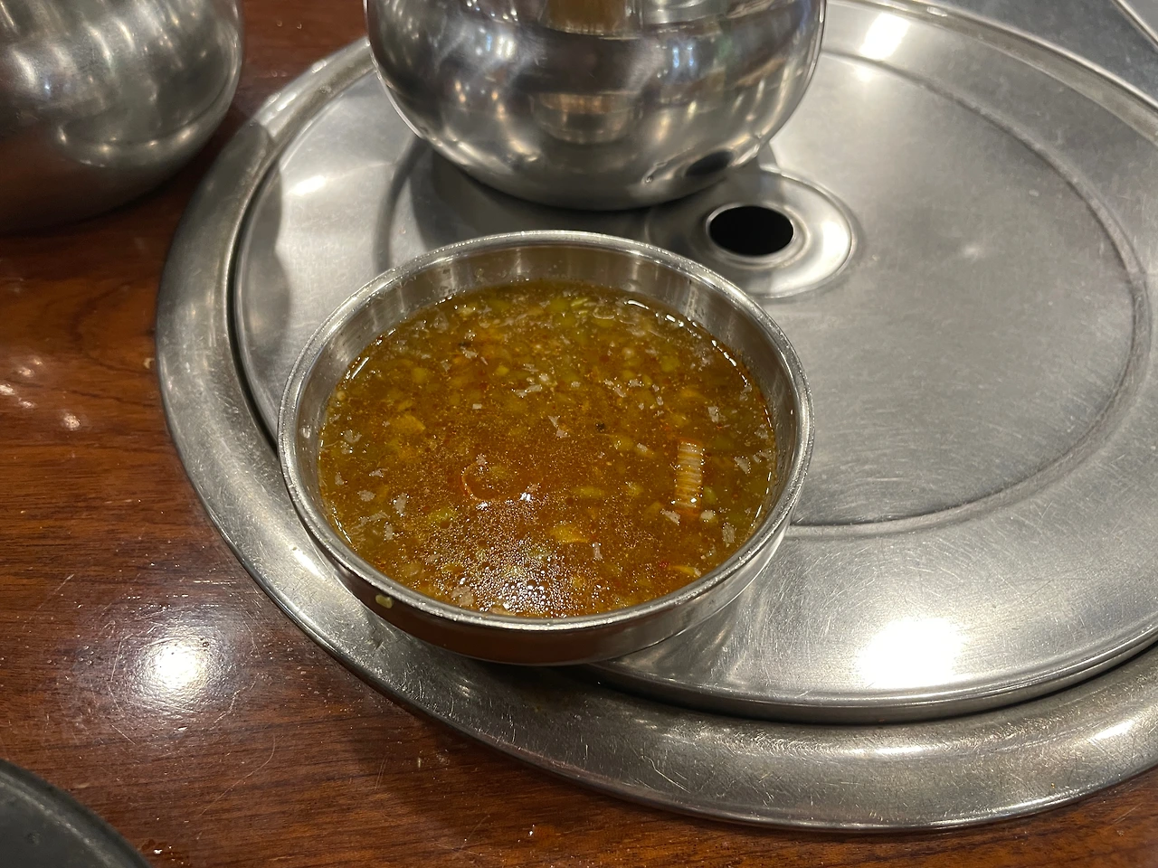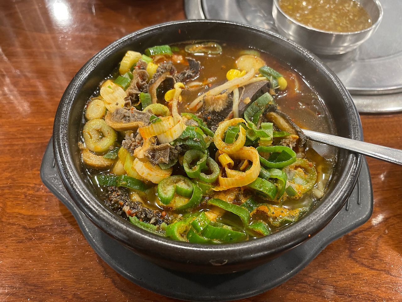 위에 사진에서 잘 보일지 모르겠는데, '양'이 듬뿍 들어있다. '양'은 소의 위인데, 식감이 쫄깃하고, 맛이 고소해 내장 국밥에 많이 쓰인다. 저 '양'을 적당히 집어, 위에 소개한 소스에 찍어먹으면 쫄깃,고소,새콤,달콤한 갖가지 맛의 향연을 즐길 수 있다.