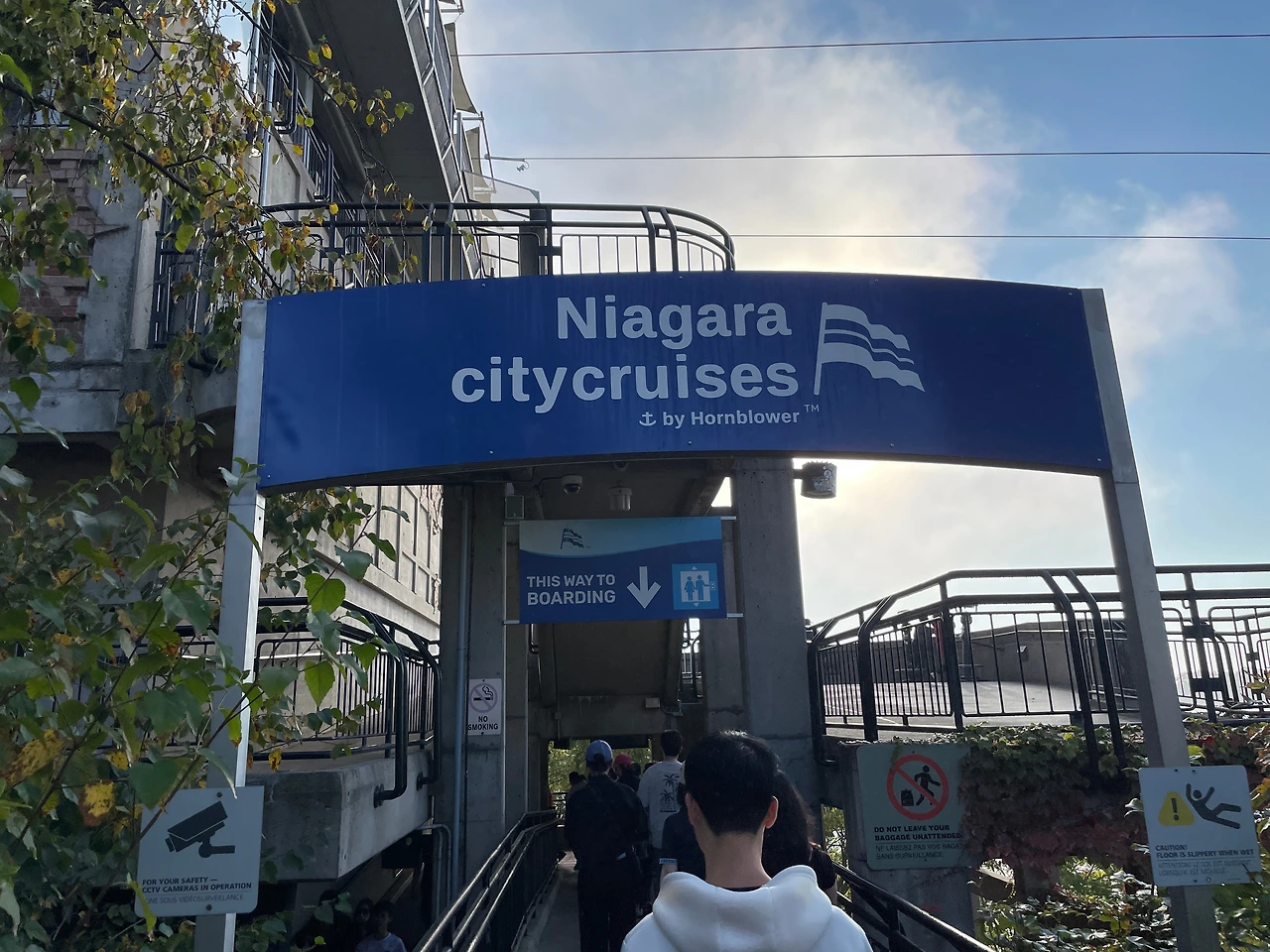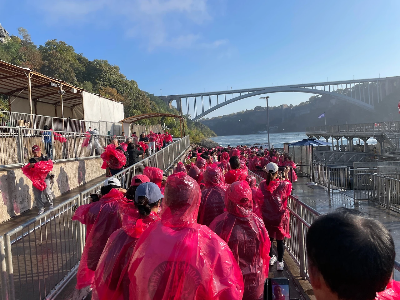기왕 나이아가라 폭포에 왔으니 가장 가깝게 다가가서 보고싶다. 가까이 가면 엄청난 물이 쏟아진다. 그래서 우의를 나눠준다. 빨간 우비를 입은 줄이 길다. 아래 사진 멀리 보이는 다리가 ‘레인보우 브릿지’로 캐나다와 미국을 연결하는 통로다. 우리도 저 다리로 건너왔다.