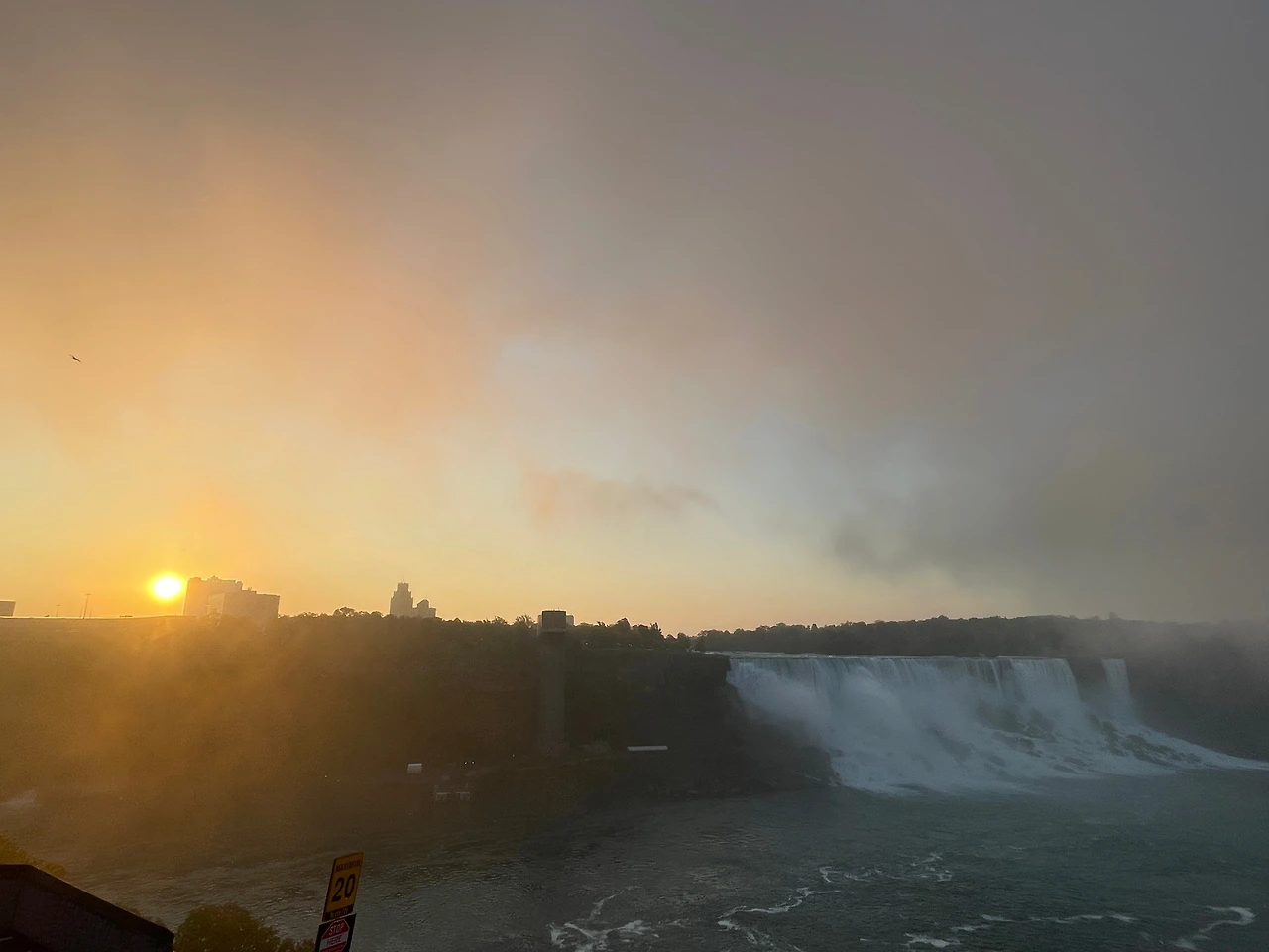 걷다가 폭포까지 왔다. 여기서 보이는 저 강 건너편은 미국이다. 아침의 나이아가라 폭포는 안개에 쌓여있다. 해가 떠오르니 조금씩 모습을 드러낸다. 그 규모에 다시 한번 압도된다.