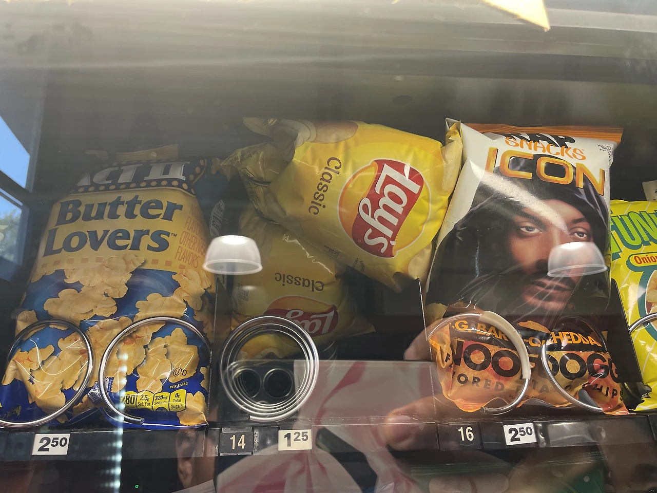 중간에 들른 휴게소 밴딩머신에서 과자 하나 사려고 했는데, 과자가 걸려서 안나온다. 미국한테 돈 뺏김.
