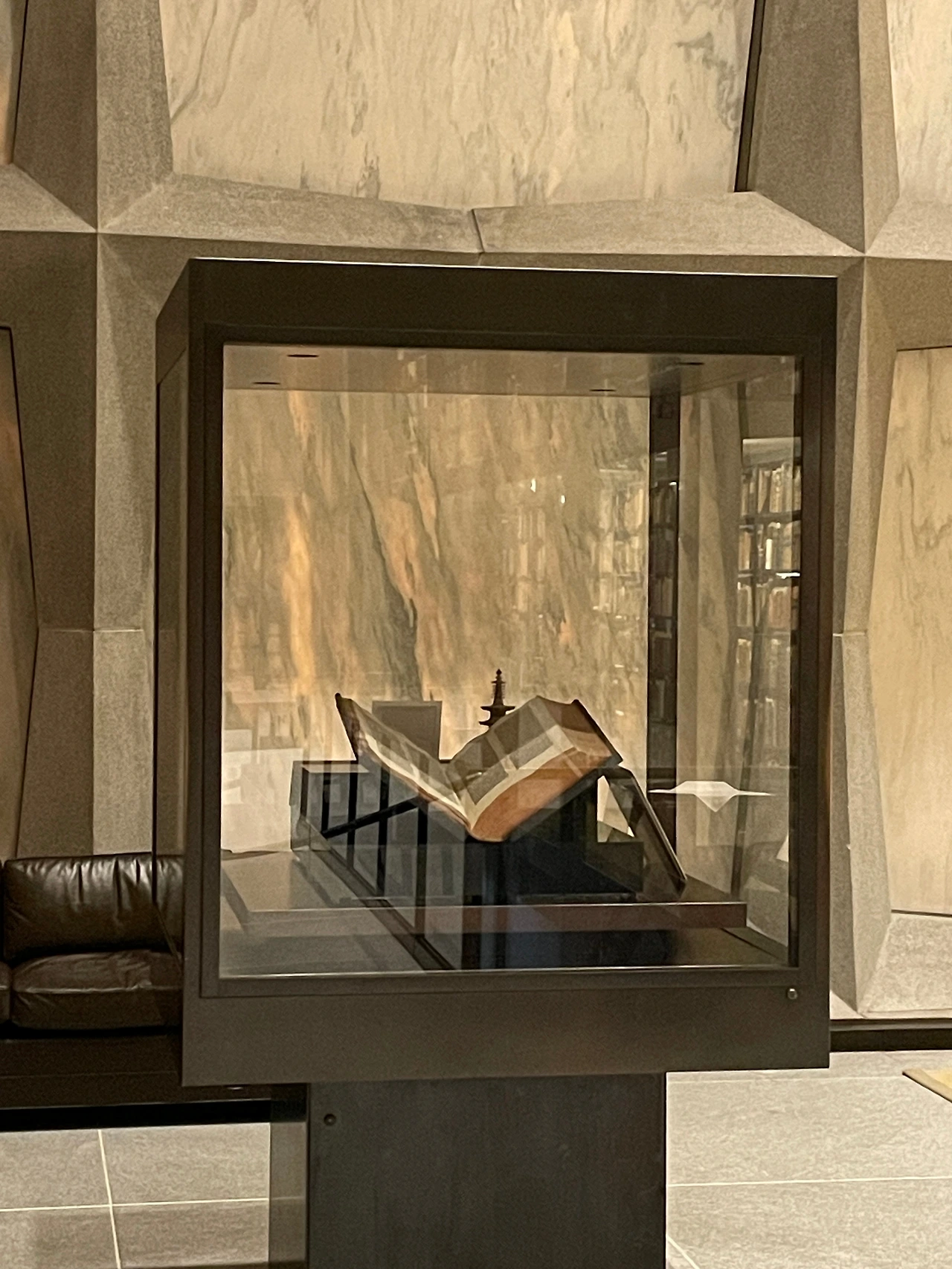 바이네케 도서관 내에 있는 구텐베르크 성서. 금속활자로 인쇄한 최초의 성경이다. (가장 오래된 금속 인쇄본은 고려의 직지이다.)