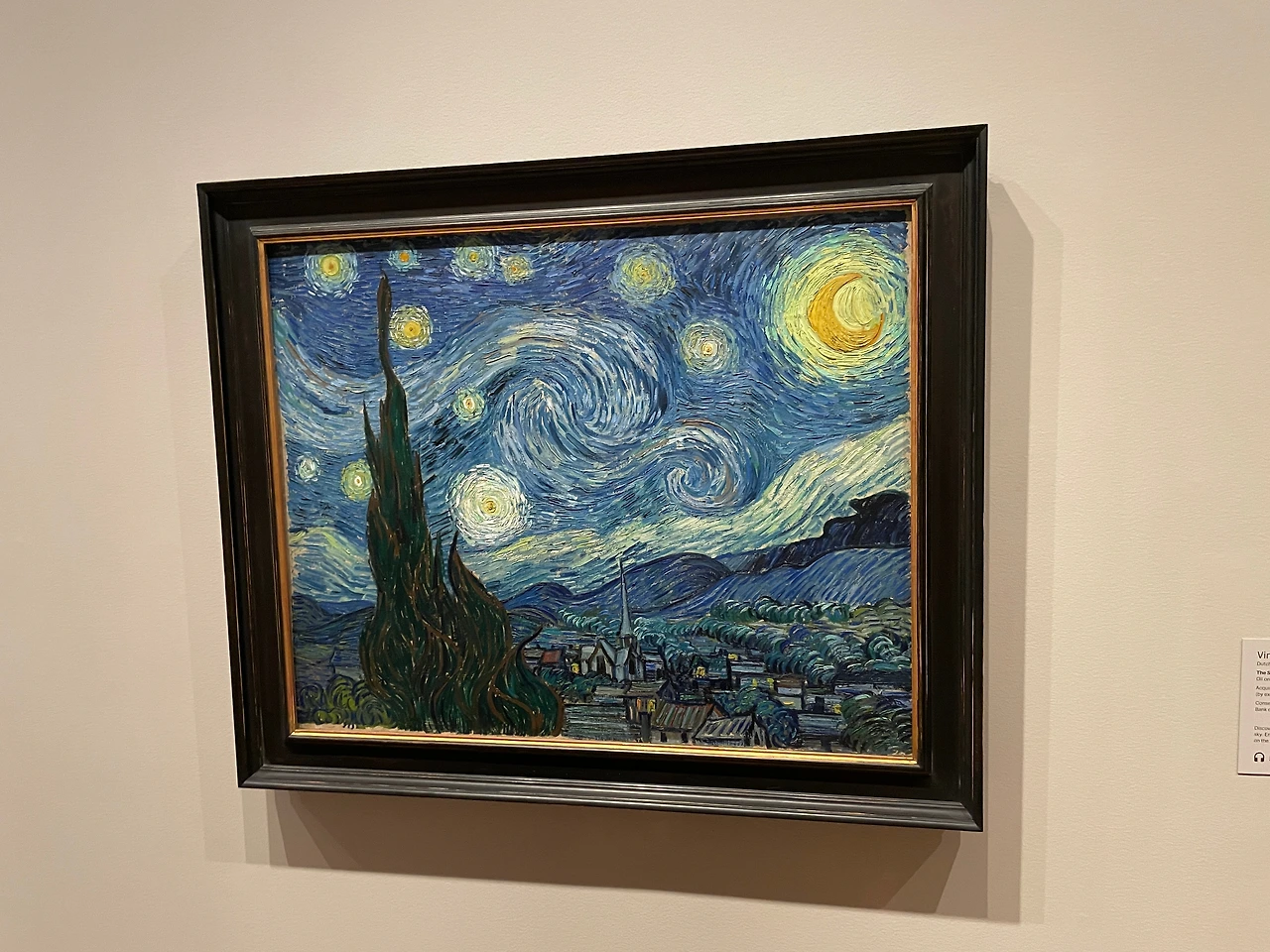 그 유명한 ’별이 빛나는 밤에‘가 있다. 고흐가 죽기 1년 전 정신병원 창문으로 본 풍경을 그렸다. 아주아주 가까이 다가가서 봤다. 작은 붓터치까지 관찰할 수 있었다. 이런 감동이.