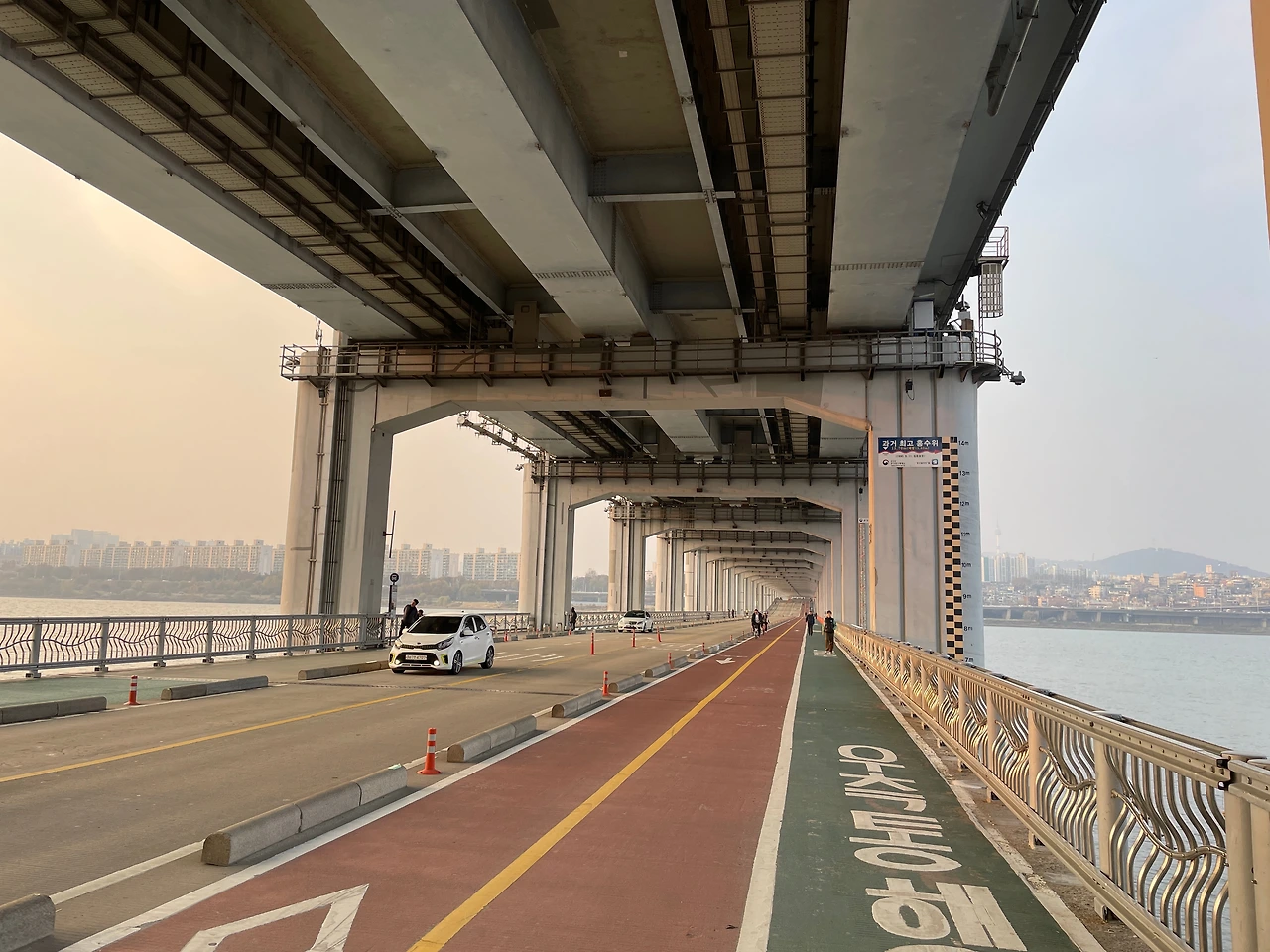 이제 잠수교를 건너 한강을 넘는다. 옛날옛적엔 쪽배를 타고 한강을 건넜겠구나.
