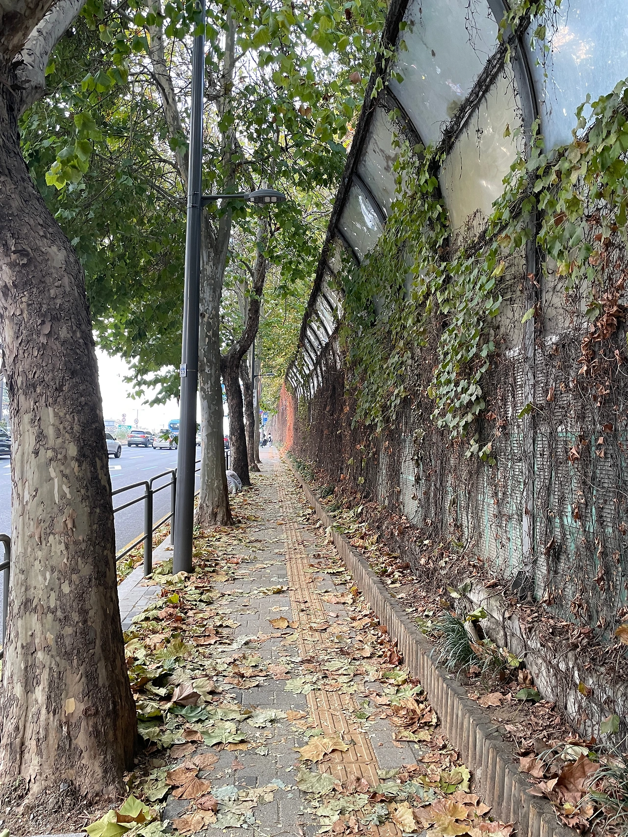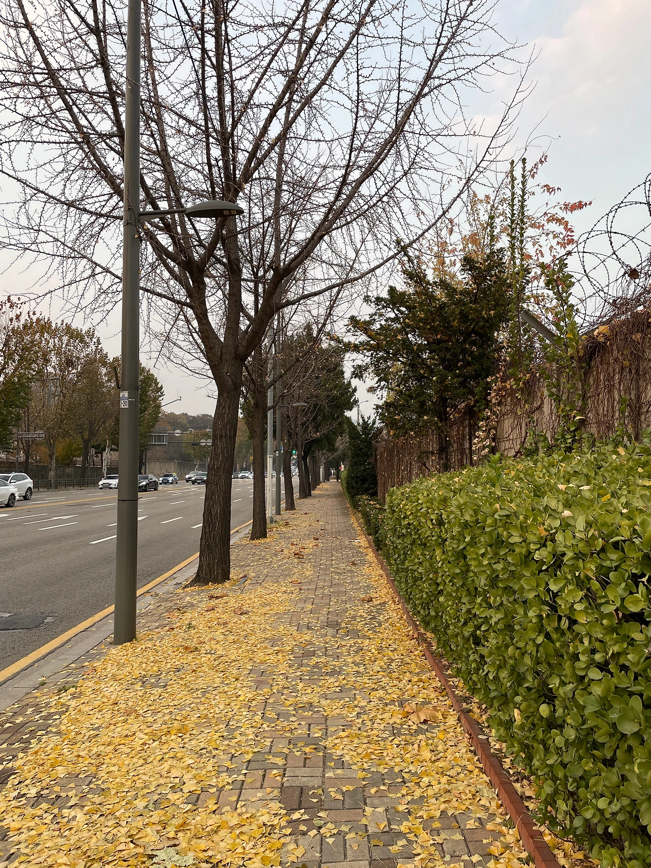 미군기지 앞, 떨어진 은행 잎에 바닥이 노랗다.