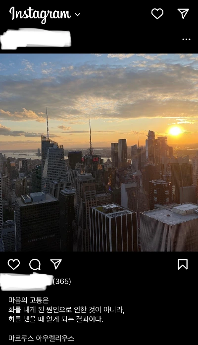 사진은 뉴욕에서 찍었던 일몰인데, 어쩐지 마지막 게시에 어울릴 것 같아서 골랐다. 모든 명언 마다 직접 찍은 사진을 한 장씩 덧붙였다. 그러고보니 사진도 365장을 게시했구나. 나는 사진을 잘 찍지 않지만, 1일 1명언 챌린지를 위해서 올해는 제법 많이 찍었다. 그것도 이제 끝이네.