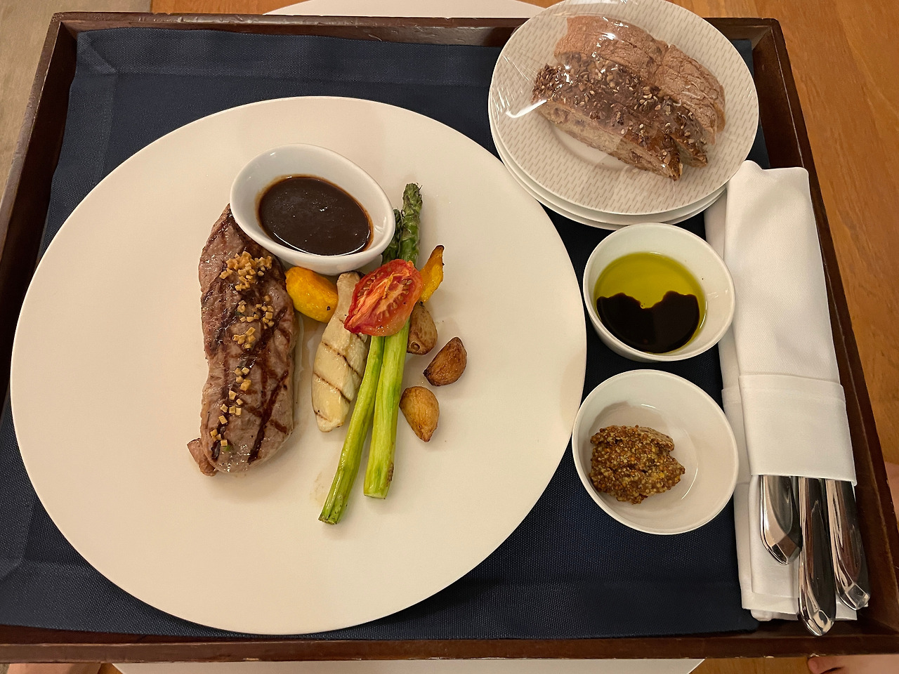 저녁식사로 룸서비스 시켜봤다. 스테이크. 이렇게 방으로 오던데, 고기가 맛이 괜찮다. 빵은 남겼다.