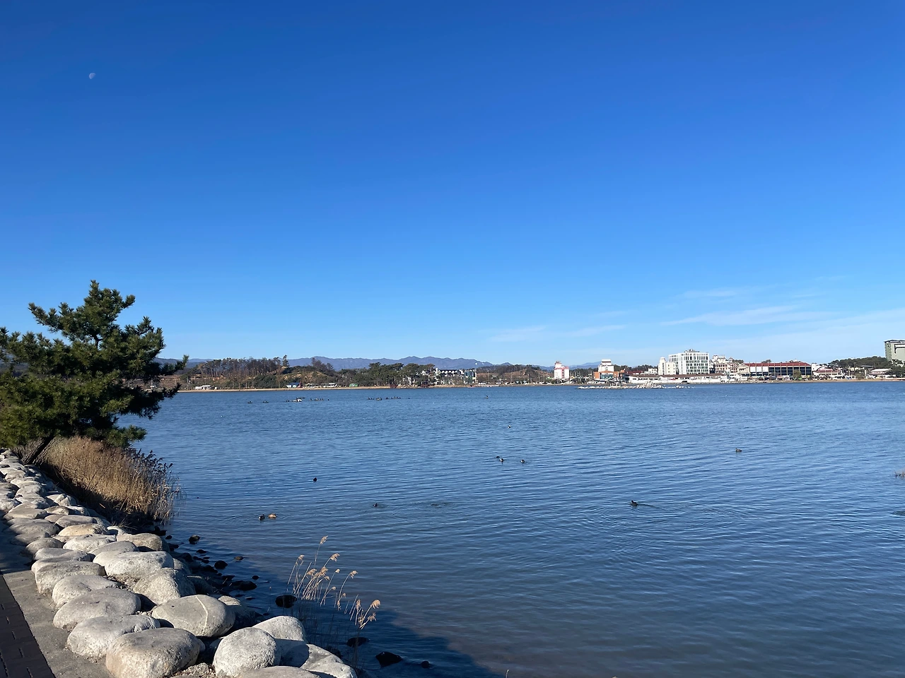 경포호에 들러 산책한다. 걷기 좋은 날씨다. 물 위에 오리들이 많다. 너흰 안춥니.